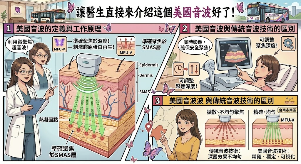 美國音波是一種高頻音波技術,透過非侵入性的方法,對皮膚進行深層治療。它的主要作用是改善皮膚的緊實度、減少皺紋和細紋,並增強皮膚的彈性,從而達到抗衰老效果。